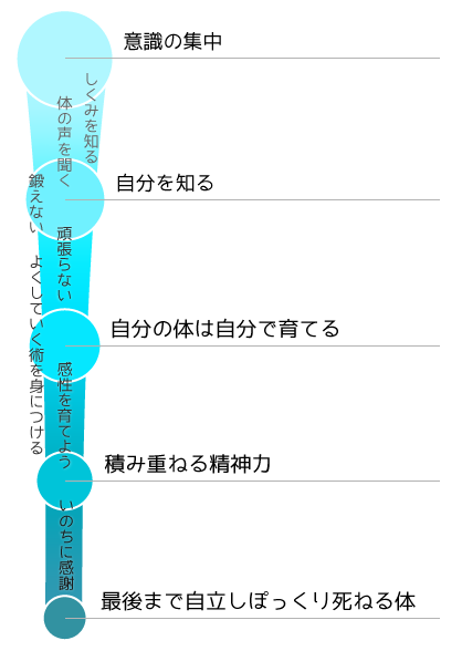 一人でも多くの人が、いきいきとした力強い生き方を実現するために、 上記(1)の概念と方法を人々に伝え続けます。きくち体操は(1)の概念 を本来の『体育教育』と考え、特に人間形成において最も大切な時期である 義務教育年齢の児童・生徒に、これを伝え、生きる力と意味を身につけて 成人できるように貢献したいと考えます。